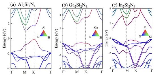 The projected electronic band structure and density of states (DOS) of (a) AlSiN, (b) GaSiN and (c) InSiN. The Fermi energy is set to 0 eV.