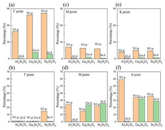 The projected electronic band structures and density of states are calculated based on DFT-PBE level, as shown in Figure 4. For AlSiN, it is an indirect bandgap semiconductor (1.21 eV) with valence band maximum (VBM) located at the K point and conduction band minimum (CBM) located at the M point. The conduction (CBE) and valence (VBE) band edges are mainly determined by N1:p states and Al:p states, respectively (Figure S2). For GaSiN, VBM is located at a special point near K, and CBM is located at the M point, resulting an indirect bandgap of 2.84 eV, while the CBE and VBE are mainly determined by Ga:p and Ga:p,d states hybridized with N1:p, respectively. Most importantly, InSiN is a direct-bandgap (1.49 eV) semiconductor, with both CBM and VBM located at the point, while CBE mainly originates from the hybridized In:s,p and N1:s,p states, and VBE is mainly determined by N1:p states. The band edge switch is clearly related with the occupied d orbitals in GaSiN and InSiN, which are absent in the AlSiN monolayer (Figure S3). In order to explore the origin of the indirect-to-direct bandgap transfer, we plot the atomic orbital components of the highest valence band and the lowest conduction band at , M and K points for three MSiN monolayers, as shown in Figure 5. From Figure 5a, we can see that the highest valence band at is composed of N1:p states in AlSiN and hybridized N1:p and M:d states in GaSiN (InSiN). The pd couplings only emerging in GaSiN/InSiN would push valence energy level at point up []. Although the pd couplings would also push the energy level at K and M points up, the energy increase at might be larger than that at the K and M points because of the higher percentage of p and d orbitals in compared with K and M points (Figure 5c,e), finally resulting in the valence energy level at to be the highest among the three points, i.e., leading to be VBM in InSiN. On the contrary, the pd coupling would push the conduction energy levels at M and K points up, leading the conduction energy level at to be the lowest among the three points, i.e., becoming CBM in InSiN. In one word, the existence of occupied d orbitals plays a key role in determining the directness or indirectness of bandgap in MSiN.