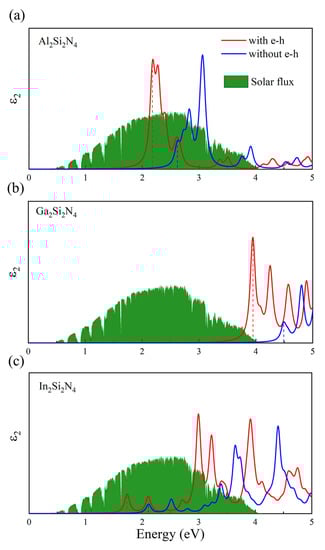 Generally, the exciton binding energy is very large in ultrathin 2D materials, such as 0.63 eV in MoS [], 0.7 eV in InSe [] and 0.6–2.0 eV in graphene-like h-MN (M = B, Al, Ga and N) []. Considering the relatively large thickness of MSiN, it is necessary to study the relationship between exciton binding energy and the thickness of 2D materials. Based on GW-BSE methods, we calculate the quasi-particle bandgaps, exciton binding energy (Table 1) and imaginary parts of the dielectric function (Figure 6) of MSiN monolayers. The first prominent peak defined as the optical gap E is located at 2.18, 3.95 and 1.73 eV for AlSiN, GaSiN and InSiN, respectively. This excitonic peak corresponds to the interband transition from the highest valence band to the lowest conduction band at the K, M and points for AlSiN, GaSiN and InSiN, respectively. Furthermore, the exciton binding energies are calculated to be 0.44, 0.54 and 0.38 eV. It is clear that the larger thickness of materials (Table 1) results in smaller exciton binding energy. From Figure 6, the absorbance spectra of AlSiN and InSiN have a large overlap with the AM1.5G solar flux in the visible wavelength region, demonstrating their potential application in detectors or solar cells. Moreover, the 2D GaSiN monolayer shows high lightharvesting ability in the ultraviolet wavelength region.