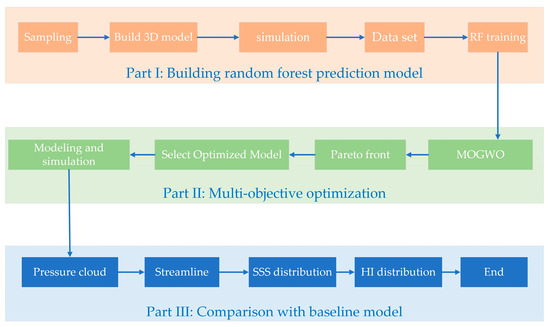 Related studies have confirmed that hemolysis is an important cause of blood damage in blood pumps [57,58,59]. In the published literature, most scholars reduce the HI value in blood pumps and thrombus by manually adjusting the impeller and volute parameters [60,61,62]. However, trial-and-error analysis and numerical simulations can be time-consuming and ignore the co-influence of the impeller parameters on the hydraulic performance and HI performance, which may result in bypassing the optimal combined solution. The multi-objective optimization algorithm can obtain a set of optimal solutions in a short time and select the final optimization result independently according to the requirements, which greatly improves optimization efficiency and speed. In this study, we developed an optimization process for a screw centrifugal blood pump using a multi-algorithm machine-learning approach. The whole process is divided into three parts: random forest algorithm prediction, MOGWO optimization, and internal flow field analysis.