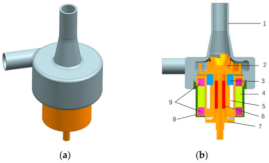 Figure 2. Three-dimensional view and cross-sectional view of the screw centrifugal pump. (a) Three-dimensional view of the screw centrifugal pump. (b) Cross-sectional view and internal structure of the screw centrifugal pump. 1—house; 2—impeller; 3—magnet location sleeve; 4—coil winding; 5—magnet; 6—bearing; 7—motor inner casing; 8—motor housing; 9—locating sleeve.