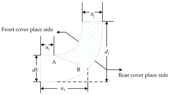 In the design process of centrifugal pumps, the axial projection diagram of the impeller is crucial. This is because a large number of parameters in the diagram can control the shape of the impeller [30,31] and changing any of these parameters will deform the impeller. This provides very convenient conditions for impeller parameterization. Figure 3 is the axial projection of the baseline model impeller. The shaded area in the figure represents the shape of the blade axis surface. Moreover, d 2 is the impeller’s outer diameter. In this study, this parameter was fixed at 30 mm. In addition, d S denotes the impeller inlet diameter, b 2 denotes the blade exit width, and the two circular curves represent the front cover line of the impeller and the rear cover line of the impeller, respectively. The straight line running from A to B is the position of the blade inlet side and it is defined by u 1 and u 2 , which denote the radial length from the intersection of the blade inlet edge line with the front and rear cover profiles to the impeller inlet, respectively. It can be seen that the position of the blade inlet edge is controlled by u 1 and u 2 together. There are certain impeller parameters that cannot be described visually in the axial projection diagram, such as the blade wrap angle ( ϕ ), the blade exit angle ( β 2 ), and the axis ratio of the leading edge of the blade ( A r ). These are also part of impeller parameterization as they have an impact on the impeller shape, hydraulic performance, and hemolysis performance of the blood pump [32,33].