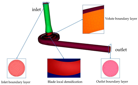 In this study, Fluent Meshing, a fast and high-quality pre-processing meshing software, was used to discretize the computational domain. High-adaptability polyhedral mesh was used inside the computational domain. Six-layer structured mesh was used for the walls. In addition, the mesh of the blade wall was encrypted to ensure a more accurate calculation of flow details. Finally, the orthogonal qualities of the meshes were all greater than 0.3, and y + near the wall was less than 5, conforming to S S T   K ω turbulence modeling standards. To reduce computational costs, the mesh independence of the baseline model was verified at a speed of 3900 rpm and a flow rate of 5 L/min. The mesh-independence verification carried out is presented in this paper. Table 2 shows that when the number of meshes was more than 3,825,107, the pressure generation value no longer changed. To reduce the simulation time, the number of meshes in option 3 was chosen.