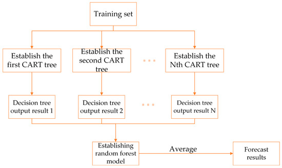 Random forest (RF) was proposed by Leo Breiman [50] in 2001. As shown in Figure 6, it is a prediction algorithm that combines bagging integrated learning theory with a random subspace. Its core lies in N CART (classification and regression trees) composed of g ( D , θ n ) . The final prediction result can be obtained by averaging the regression results of all regression trees, which means the random forest algorithm is more resistant to overfitting, has a lower error rate [51], and is more accurate when making predictions on small samples.