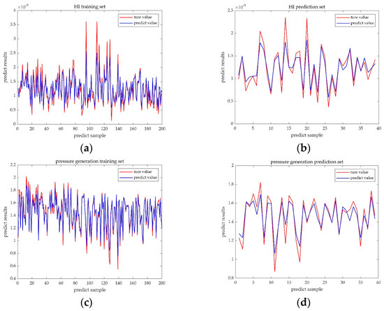 Figure 7. Comparison of the RF predictive value and true value. (a) Comparison result of the HI training set. (b) Comparison result of the HI prediction set. (c) Comparison result of the pressure generation training set. (d) Comparison result of the pressure generation prediction set.