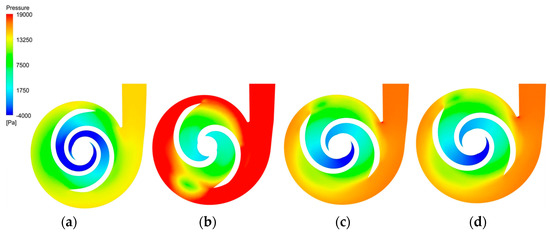 Figure 11. Pressure distribution clouds. (a) Pressure cloud of the baseline model. (b) Pressure cloud of the A−point model. (c) Pressure cloud of the B−point model. (d) Pressure cloud of the C−point model.