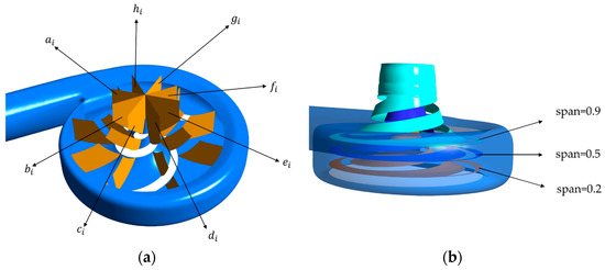 When building proxy models for expensive functions or experimental data, the pre-experimental design is particularly important for the selection of the initial sampling points. Thus, how to achieve good space-filling effects with as few samples as possible is a hot research topic. In computer experiments, classical sampling methods include Monte Carlo (MCS), Latin hypercube sampling (LHS), Sobol sequence, etc. [35]. Among them, Latin hypercube sampling is popular. It is a random sampling method that was improved by Mckay et al. [36,37] based on the Monte Carlo sampling method. They enhanced a core sampling strategy with stratified sampling, which ensures full coverage of the multivariate distribution and accuracy, while significantly reducing the sample size. In this study, 240 sets of impeller parameters were randomly generated using the Latin hypercube sampling method in the range of impeller parameter variation. Thereafter, all of them were modeled and numerically simulated to obtain a database consisting of impeller parameters and head and HI values.