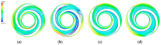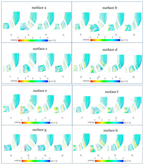 The blade-to-blade sections were intercepted in the radial direction for spans of 0.2, 0.5, and 0.9, respectively. There were more vortices in the A-point model as compared with the other models. In the cross section with a span = 0.2 (Figure 14b), there was a significant backflow in the stream channels of both blade-leading edges for the A-point model. As the impeller diameter increased, the stream velocity in the middle section of the pressure side of the blade decreased, and the streamline spread toward the impeller outlet. The velocity vector on the suction side of the trailing edge of the blade suddenly changed and a stagnation zone was formed. In addition, there were two high stream velocity zones at the gap between the impeller and the volute, which were the same as the monitoring surface e-h, so this was not repeated. In the span = 0.5 cross section (Figure 15b) and the span = 0.9 cross section (Figure 16b), it can be clearly seen that a relatively large low-speed backflow area covered almost all of the pressure surface of the blade, indicating that the most serious area of backflow occurred on the front cover side of the blade working surface. From the three cross sections of the B-point model (Figure 14c, Figure 15c and Figure 16c), it can be seen that the streamlines within the impeller of the B-point model were uniformly distributed and close to the blade profile. Moreover, they fit closely to the blade and there was no stream separation region in the blade suction surface. In addition, the stream velocity in the stream channel was controlled in the range of 1 m/s~4 m/s, and the stable stream pattern minimized the destruction of red blood cells in the stream channel. Three radial sections of the C-point model exhibited similar stream conditions as those of the B-point model, but in the span = 0.5 and 0.9 sections (Figure 15d and Figure 16d), the left blade suction surface had fewer low-velocity areas and reflux areas (Figure 15c and Figure 16c), which meant the C-point model had the lowest risk of thrombosis.