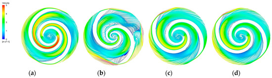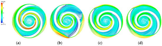 Figure 18. Vortex distribution. (a) Vortex distribution of the baseline model. (b) Vortex distribution of the A-point model. (c) Vortex distribution of the B-point model. (d) Vortex distribution of the C-point model.