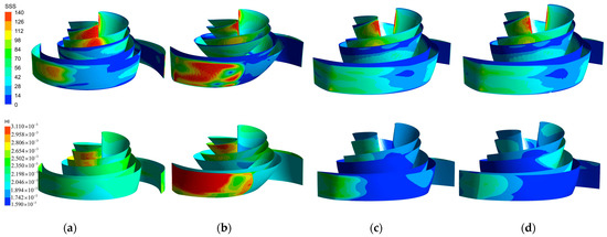 In the HI index formula, the SSS value dominates, so the distribution of SSS correlates with the HI value distribution of the blood pump. Figure 17 compares the SSS distribution clouds on the blade surfaces of the four models and the HI index distribution clouds. In all models, the SSS on the pressure surface of the blade was generally higher than that on the suction surface. The majority of the HI values of the baseline model blade (Figure 17a) were between 1.894 × 10−3 and 2.502 × 10−3, and the high SSS region (100 Pa–140 Pa) was mainly concentrated in the flow path near the leading edge of the blade. Thus, there was a local high HI region at the same location on the HI distribution map. The high SSS region and the high HI region of the A-point model were the most widely distributed. The larger blade area and the chaotic flow pattern on the pressure side of the blade (Figure 15b) led to a sudden increase in SSS at the leading and trailing edges of the front cover side of the blade (Figure 17b), so a large high SSS region (>100 Pa) and a large HI region covered the entire trailing edge of the blade. The B-point model (Figure 17c) exhibited the smallest high SSS region, except for the high shear region at the leading edge of the blade, with SSS in the rest of the parts remaining below 100 Pa. From the HI distribution, it can be seen that the middle section of the blade caused the least damage to the blood. This was essentially below 1.742 × 10−3. In the leading and trailing edges of the blade, the HI value rose to 2.654 × 10−3. The C-point model maintained a similar HI distribution and SSS distribution as the B-point model, but the degree of blood damage at the impeller inlet was slightly higher than that of the B-point model due to the difference in the shape of the leading edge of the blade.