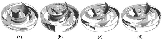 where F denotes the Frobenius parametrization of the matrix, and A and B represent the deformation and rotation of a point in the flow field, respectively. In this study, Q = 0.01 was used to identify the vortex in the impeller domain, as shown in Figure 18. The figure shows that most of the vortices for all models were concentrated on the blade surface and the impeller exit, and the vortex distribution in the blade mid-working surface and trailing edge of the A-point model (Figure 18b) was denser. Vortices still existed on the blade leading-edge surface for the B-point model and the C-point model, but the density of vortices at the exit and in the flow channel was significantly lower.