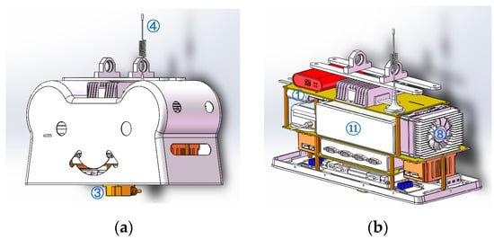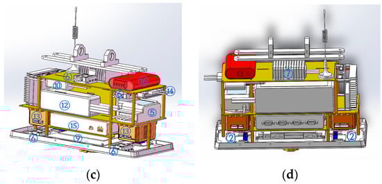 The layout of on-board equipment. The main equipment is numbered according to Table 3. (a) Base link appearance. (b) Inside oblique drawing (left). (c) Inside oblique drawing (right). (d) Inside oblique drawing.