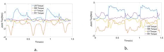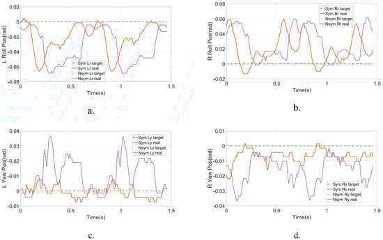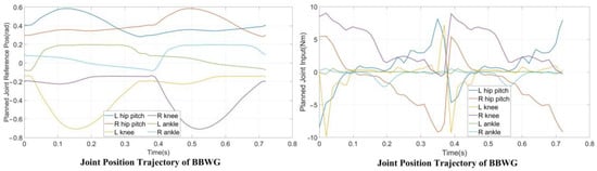 From the joint position trajectories in Figure 8, we can also find that the amplitudes of the left and right legs of the symmetrical gait are equal, and the shapes and timing are also similar. However, a significant difference can be observed in the non-symmetrical gait. This means that the state exchange constraint during the transitions effectively introduces the symmetry requirement at the joint level. The same phenomenon can also be seen in the input trajectories in Figure 7, showing that the input trajectories of the symmetrical gait changed regularly, and the unsymmetrical gait behaved desultorily, especially for the pitch joints and knee joints. The peak torque of the symmetrical gait is observed at the pitch joints of 8.4 Nm, and the non-symmetrical gait takes 10.2 Nm without consideration of the ankles. Regularity and small peak torque imply that the gait is easier to implement and track by the controller, i.e., the proposed planner can provide more realizable joint trajectories with specific patterns for walking on flat terrain.
