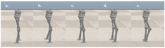 Five key frames of dynamic simulation. (a) The right supporting foot is taking off from the ground. (b) Right foot is swinging forward. (c) Right swing foot is touching down (d) Left foot is taking off from the ground. (e) The left foot is swinging forward.