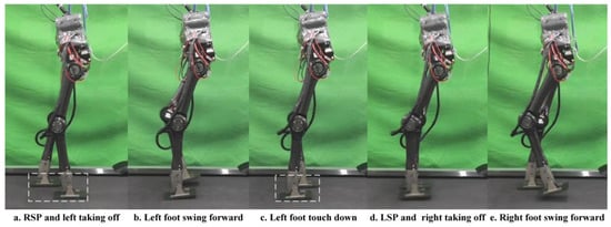 The complete gait of non-symmetrical walking, which is shown in Figure 9, starts from the taking off of the left foot in the RSP and ends at touching down in the LSP. The white dashed rectangles demonstrate that the step length of the RSP is much longer than the LSP, i.e., the robot is limping on the treadmill, which can be observed clearly in the supporting video. Relatively, the gait generated by our proposed planner shows a more natural pattern in Figure 10, where the step length of the LSP and RSP are almost identical. It means that the approximately linear foothold constraint works well in three-phase planning. On the other hand, due to the duration constraint, the left swing foot and right swing foot swing at almost the same speed in the LSP and RSP so that we can observe the robot stepping naturally.