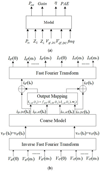 The AC signals of the transistor mainly contribute to the large signal response. By adjusting the AC signal, the power response of the model can meet the precision requirements. If the AC characteristic of the coarse model does not match the fine data well, the output mapping network is added to the output ports of the coarse model. The output mapping network can improve the AC characteristic of the coarse model without affecting the DC characteristic of the coarse model. The schematic of the analytical AC model is given in Figure 3. The terminal signals of the new Neuro-SM model are shown in Figure 3a. The input signals of the AC model are bias voltages and , load impedance , source impedance , input power and frequency . The output signals of the model are output power , power-added efficiency , gain and power efficiency . Figure 3b shows the detailed process of the AC model, which includes the inverse fast Fourier transform module, coarse model, output mapping network and fast Fourier transform module. The accurate outputs of the AC model, which are , , and , can be calculated with the mapping currents and the excitation signals. The AC characteristic of the device is represented by the nonlinear relationship between the input and output signals of the AC model. An appropriate coarse model can provide a good foundation for AC characteristic modeling.