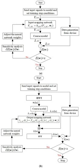 An efficient training algorithm is an important part of transistor modeling, which determines the efficiency of the modeling process. This section introduces the new training method for the separated model. The training process of the DC characteristic model is shown in Figure 4a. In the DC model training, the input mapping neural network is trained to minimize the deference of DC between the new Neuro-SM model and the fine data. During training, the weights in the input mapping neural networks are optimized with the gradient information from the sensitivity analysis. We set to establish the input unit network, which prevents the training error from increasing. Meanwhile, the parameter in is changed in the training process, decreasing the errors between the data and the model conspicuously. When the training error between the data and the model meets the user-defined threshold ε, the DC training stage finishes. The training error reflects the learning ability of the developed model, and the test error is used to check the prediction ability of the developed model. When the training error is small and the test error is large, we can add more training data or reduce the hidden neurons of the mapping network. When both training error and test error are reduced to the threshold, the model can represent the modeled device well.