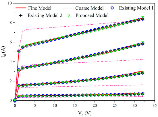 To further show the detailed results, we compared the DC responses of four models with the fine data at 230 bias. The errors of existing model 1, existing model 2 and the proposed model are 0.82%, 0.73% and 0.76%, respectively, while the error between the fine model and coarse model is 8.55%. It demonstrates that the separated model enhances the DC response of the coarse model, achieving the accuracy of the existing models. The I–V curves in Figure 5 show that the separated model perfectly represents the fine DC data.