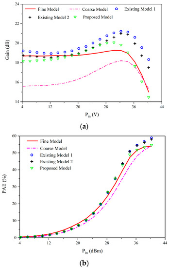 The parameters comparison between the models and the fine data. (a) Gain versus Pin. (b) PAE versus Pin.