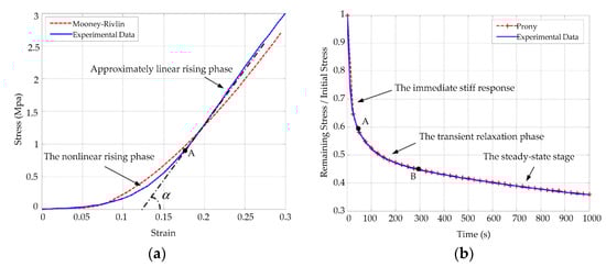 As shown in Figure 1, corneal material models including Mooney–Rivlin and Prony series constitutive equations are simulated in ABAQUS. In Figure 1a, the relationship curves of corneal stress–strain show obvious linear features after a nonlinear rising stage. In Figure 1b, the behaviors of the cornea under a stress relaxation test are composed of an immediate stiff response, a transient relaxation phase, and a final steady-state stage [28].