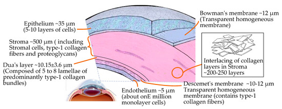 The mean corneal thickness is 0.67 mm, and the central thickness is 0.55 mm. From a microscopic point of view the cornea has a complex layered structure [30], including the epithelium, Bowman’s membrane, the stroma, a novel pre-Descemet’s layer (Dua’s layer) [31], Descemet’s membrane, and the endothelium, from the outside to the inside, as shown in Figure 2.