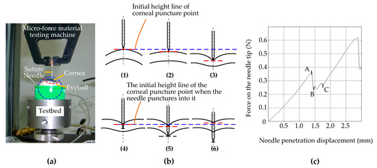 In order to simplify the mechanical behavior study of the interaction between rigid surgical instruments and the cornea, we took the process of a needle piercing the cornea as an example to measure the micro-force of a needle piercing the cornea. As shown in Figure 3a, the test system consists of a testing machine, fresh pig eyeball samples, different types of surgical suture needles, and a test bed; among these, we used an Instron 5848 Micro Tester as the testing machine, provided by Institute of Mechanics, Chinese Academy of Sciences. It has a load resolution of 50 mN and a position accuracy of 1 nm. The surgical suture needles were fixed on the test machine through a self-made needle handle gripper, which drove the suture needles to move in the vertical direction with a stroke of 100 mm and a speed of 0.3 to 25 mm/s. Figure 3b shows the corneal deformation during the whole piercing process. To simplify the problem, the cornea is roughly divided into three layers when describing corneal deformation: the upper surface, the stroma, and the lower surface. Figure 3c shows the relationship curve between the stress of the suture needles and the penetration displacement.