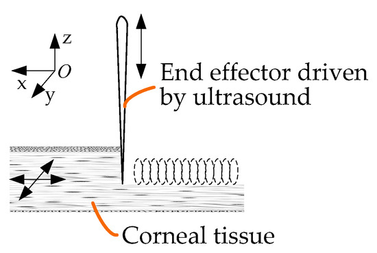 In ultrasonic vibration cutting, the end effector first generates vibration and transfers the vibration energy to the part of particles directly in contact with it, and then the energy is gradually introduced into the tissue. The corneal tissue consists of several layers; each layer is regarded as being composed of many particles closely connected with each other. Once a particle in the medium is disturbed, the particle will have a movement away from its equilibrium position, which is bound to push its adjacent particles to move, such that each layer of particles will alternately be subjected to the pressure or tension caused by the wave. A particle here is actually a macroscopically small tissue volume element whose physical properties are approximately uniform. The small tissue volume ΔV has the mass ρΔV. In an ideal case, without considering energy attenuation, the particle adjacent to the end effector also follows the trajectory motion shown in Equation (4), and the particle’s vibration acceleration can be obtained through continuous derivation: