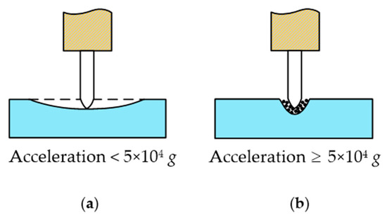 As can be seen in Equation (7), when the ultrasonic cutting vibration frequency and acceleration are very high a great local alternating cutting force will be generated, which can easily reach the elastic limit of the cornea and cause it to break and be divided. As shown in Figure 6, according to relevant studies, if mechanical vibration with a particle acceleration of equal to or more than 5 × 104 g is applied to living biological tissue then tissue can be quickly cut and will not hurt the surrounding tissue [32]. In order to meet the requirement of the cutting acceleration of corneal tissue, an ultrasound-assisted corneal trephination system with a working frequency of 35 kHz was designed.