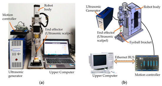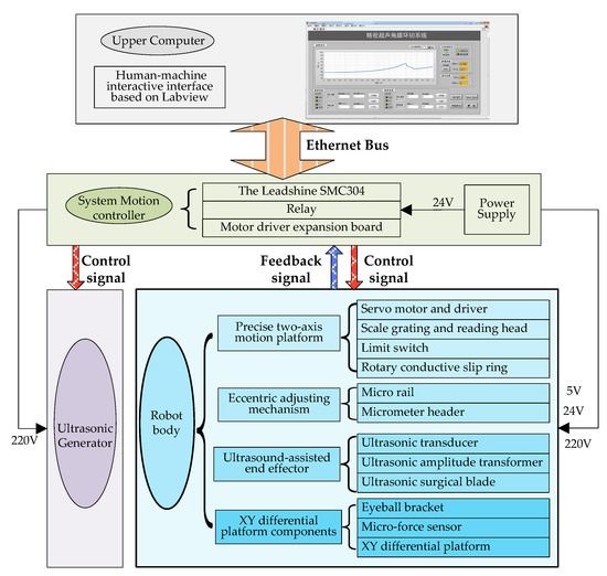 As shown in Figure 7 and Figure 8, there are four main components in the system, including an ultrasonic generator, a robot body, a system motion controller, and an upper computer. The ultrasonic generator and the corresponding end effector (ultrasonic scalpel) are the soul of the system, which can generate ultrasonic vibrations and perform the surgical operation, respectively. The robot body is the hardware mechanism that supports the end effector in completing the corneal trephination operation with different diameters. Through the control signal transmitted by the system motion controller, the robot can perform corresponding movements. The upper computer is the command sender of these control signals through Ethernet Bus. Based on the standard TCP/IP protocol instructions, the robot body can perform corresponding operations and the ultrasonic generator can also be controlled to turn on or off.