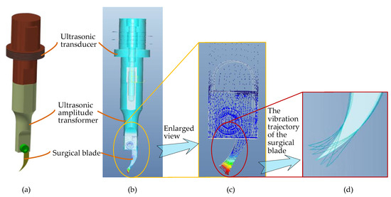 As shown in Figure 9, the ultrasound-assisted end effector consists of three main parts: an ultrasonic transducer, an ultrasonic amplitude transformer, and a surgical blade. There are three design essentials of the end effector: (1) As the surgical blade is a consumable product, a groove has been designed at the end of the ultrasonic amplitude transformer to install the surgical blade, which can be clamped by bolts, so that the blade is convenient to replace. (2) In order to achieve the effect of simultaneous cutting along the corneal surface in vertical and tangential directions, according to the principle of ultrasonic wave propagation in solids, the longitudinal vibration transducer and the curved-shape surgical blade (type 12D, a double-edged blade) are combined to realize a two-dimensional elliptical ultrasonic vibration trajectory, which is made up of longitudinal and bending vibration directions of the tip of the blade, so as to obtain an optimal two-dimensional vibration mode for corneal trephination rather than only a single longitudinal trajectory in practical application. In consideration of the disadvantages of exerting continuous pressure on the cornea, as described in Section 2.3, a two-dimensional vibration mode can make not only the longitudinal force of the surgical blade on the cornea but also the tangential force along the surface of the cornea discontinuous in the process of corneal trephination, which can improve the surgical effect. Specifically speaking, ultrasonic vibration in a vertical direction, i.e., the longitudinal vibration direction of the tip of the blade, can guarantee a specific cutting depth in corneal trephination; ultrasonic vibration in a tangential direction of the corneal trephination trajectory, i.e., the bending vibration direction of the tip of the blade, can guarantee the cutting effect in a circular motion of the surgical blade. (3) As shown in Figure 9d, we used finite element analysis software, Pro/E, to simulate the motion trajectory of the surgical blade. The results show that the tip end can generate an elliptical vibration trajectory, which can meet the two-dimensional vibration requirements of corneal trephination.