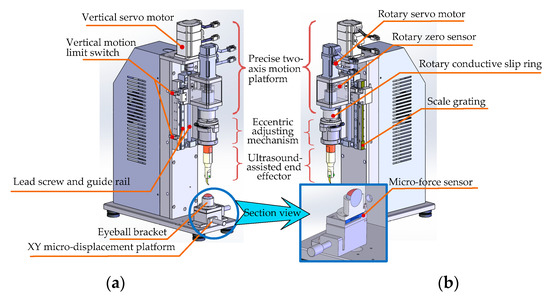 As shown in Figure 10, in order to meet the requirements of surgical operations, the robot body is mainly composed of the following four parts: (i) a precise two-axis motion platform with which to realize the feed motion of the end effector in a vertical direction and the circular cutting motion in the xoy plate (Figure 5) (including single-axis independent motion and two-axis linkage); (ii) an eccentric adjusting mechanism with which to realize the task of cutting the cornea lesions with different diameters without changing the surgical blade; (iii) the ultrasound-assisted end effector, as we discussed in the previous section, is designed to realize a two-dimensional elliptical ultrasonic vibration trajectory made up of longitudinal and bending vibration directions of the tip of the blade and to meet the cutting accuracy and incision smoothness requirements of corneal trephination; and (iv) an eyeball bracket and XY micro-displacement platform: The eyeball bracket is used to fix the surgical experimental object, and the XY micro-displacement platform is used to realize the center alignment of the surgical object and the ultrasonic scalpel. In order to realize the real-time detection of cutting force during surgery, there is a micro-force sensor (type 300G, Hyforcell Company, with a vertical force measuring accuracy of 1 mN, one DOF) embedded into the contact surface between the eyeball bracket and the XY micro-displacement platform, which can be seen in the section view of the eyeball bracket in Figure 10b.