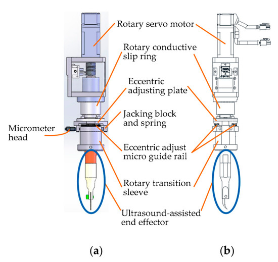 To satisfy the requirement of cutting corneal lesions with different diameters, a modular eccentric adjustment mechanism has been designed [33]. The design details can be seen in Figure 11. The mechanism mainly consists of five parts: an eccentric adjusting plate, a micro-guide rail (type SSEB6-40, MISUMI), a micrometer head (type EPD02, Yiheda Company), a jacking block with a spring, and a rotary transition sleeve for assembling the ultrasonic scalpel. As shown in the side view (Figure 11b), there are two micro-guide rails, which are symmetrically distributed below the eccentric adjusting plate. The micro-rail sliders are fixedly assembled with the eccentric adjustment plate.