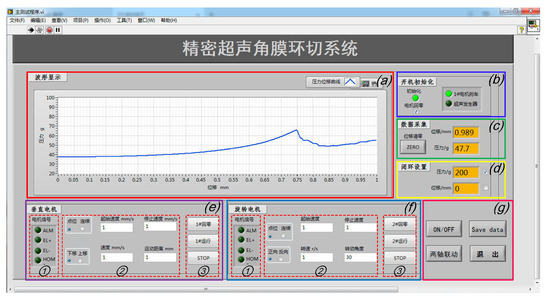 Figure 12 is the front panel of the VI program of Labview; the human–machine interaction interface is divided into the following seven function modules: (a) A curve display module: the relationship curve between the force exerted on the cornea and the displacement of the vertical downward motion of the end effector can be displayed in real time. (b) A system status indicator module, which shows the operating status of the equipment through indicator lights. (c) A force and displacement data real-time acquisition module: real-time display of the detection data of the ruler grating and micro-force sensor through the numerical display control of Labview, including the movement displacement (the same is ideally the case with the cutting depth) and cutting force of the scalpel. (d) A closed-loop control module, which sets the limit pressure or displacement value according to different operations through numerical input controls. Once the system monitors the relevant measurement parameter values (including the cutting displacement and cutting force) to reach the threshold, the robotic system will automatically stop; that is, the system can be limited by software to ensure the safety of the operation process and the accuracy of the control system. (e) A vertical motor control module, which includes ① a motor signal display area to indicate the motor rotation direction and monitor whether the system reaches the hardware limit or zero point in real time through the indicator light; ② a motor parameters’ setting area to set the movement speed and range of the motor through numerical input controls; and ③ a motor control area to start up and shut down the motor through button controls. (f) A rotary motor control module, consisting of the same function areas of the vertical motor. (g) A main control module, consisting of ultrasonic power supply button control, the simultaneous movement of two-axis button control, and system exit button control. Additionally, in order to facilitate the recording and storage of data, on the basis of a real-time display of the waveform data-saving button control is added, and the specific data in the curve can be stored in an Excel file to evaluate the cutting effect.