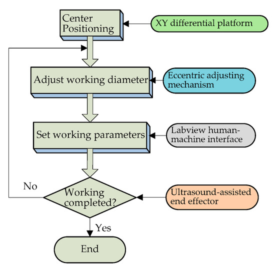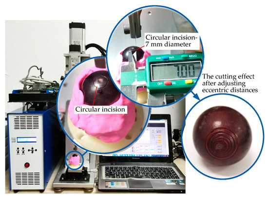 In order to verify the precision control effect and eccentricity adjustment function of the system, an experiment of cutting grapes with the ultrasound-assisted end effector was designed. Concentric circles with different diameters were cut on the surfaces of grapes successfully without changing the surgical blade, and the motion control effect of the system was verified. The experimental flow chart is shown in Figure 14.