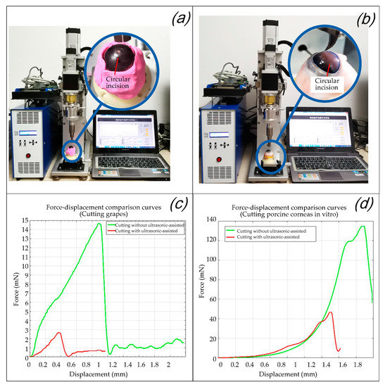 As shown in Figure 16a,b, in order to verify the effect of the ultrasound-assisted surgical operation we performed ultrasound-assisted trephination experiments on grapes and porcine eye models in vitro with a frequency of ultrasonic vibration of 35 KHz and an amplitude of 10 μm. Under different experiment conditions, comparison curves of the relationship between the cutting force and displacement with and without ultrasonic vibration assistance were drawn.