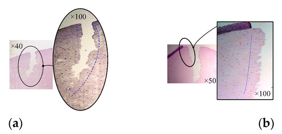 In allusion to the lamellar keratoplasty of the in vitro porcine eye model, the corneal tissue with a circle incision (in the experiment shown in Figure 16b) was sliced and observed by a light microscope after H&E staining, which was also compared with the section microscopic image of lamellar keratoplasty under the operation condition of manual trephine [9], as shown in Figure 17. It can be seen that the ultrasonic scalpel made a shallow incision due to the small set of the moving displacement of the tool; however, it can also be seen from Figure 17b that ultrasound-assisted trephination showed a more regular and less fluctuating edge shape, and the edge of the corneal slice was damaged to a lesser extent, which preliminarily proves the feasibility and superiority of ultrasonic technology applied in corneal trephination in addition to laying an experimental foundation for research on ultrasonic-assisted corneal tissue trephination.