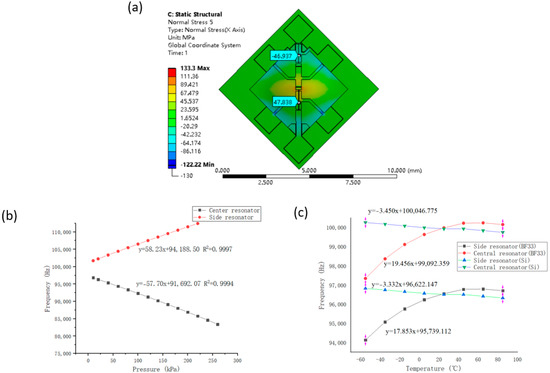 Numerical simulations: (a) positive stress distribution of the central and side resonators on the device layer under a pressure of 260 kPa, (b) resonant frequencies of the central and side resonators as a function of pressures under measurements, and (c) resonant frequencies of the central and side resonators with silicon or glass encapsulation as a function of temperature variations.