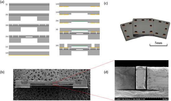 (a) Schematic of the fabrication flow chart: (i) cleaning SOI, (ii) etching pressure-sensitive film, (iii) etching device layer to form resonators, (iv) releasing resonators, (v) cleaning silicon wafer, (vi) evaporating Cr/Au, (vii) patterning Cr/Au, (viii) etching vacuum cavity, (ix) evaporating getter, (x) eutectic bonding, and (xi) etching electrodes. (b) SEM image of the cross section of the chip. (c) Images of fabricated sensor chips. (d) A cross-sectional SEM image of the resonator.