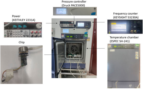 Test platform. Pressures under measurements and temperature disturbances were controlled by a pressure controller and a temperature chamber, respectively. Meanwhile, changes in resonant frequencies were detected using a closed-loop circuit.
