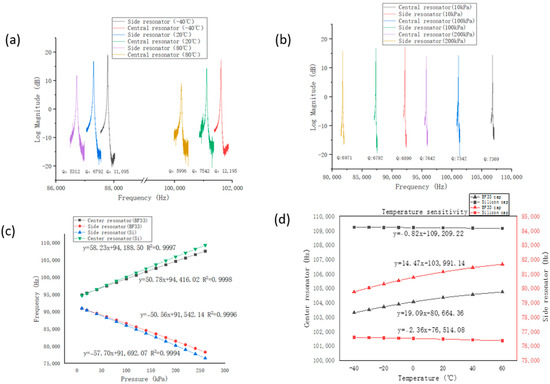 Figure 5a shows the resonance plots of the central and side resonators of the all-silicon resonant pressure microsensor at different temperatures. The increase in temperature leads to an increase in damping and quality factors. As the temperature increases from −40 °C to 20 and 80 °C, the quality factor of the side resonator decreases from 11,095 to 6792 and 5312, respectively, and the quality factor of the central resonator decreases from 12,195 to 7542 and 5996, respectively. Figure 5b shows the resonance plots of the central and side resonators of the all-silicon resonant pressure microsensor at different pressures. At 10 kPa, 100 kPa, and 200 kPa, the quality factors for the central resonator are 7642, 7542, and 7369, respectively, and the quality factors for the side resonator are 6971, 6792, and 6890, respectively, which means the quality factors are not significantly affected by pressure.