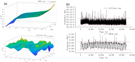 The resonant pressure microsensors were calibrated within a pressure range of 0–260 kPa and a temperature range of −40 °C–80 °C, where a polynomial fitting was performed to achieve temperature compensations by double-beam differencing. As shown in Figure 6a, the maximum fitting errors of the resonant pressure microsensor based on the glass cap were quantified as 74.2 Pa, with an accuracy of 0.03% FS. In addition, the fitting errors were significantly correlated with temperature variations. For the resonant pressure microsensor with a silicon cap, the maximum fitting errors were only 11.9 Pa, with an accuracy of 0.01% FS, and the fitting errors were independent of temperature variations. Thus, the all-silicon microsensor could significantly improve measurement accuracies by eliminating the mismatches of thermal expansion coefficients.