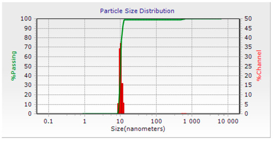 Particle size distribution of the AuNPs. The distribution is narrow and was measured using dynamic light scattering (DLS). The mean particle size of the AuNPs is 10 nm.