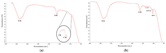 FTIR spectrum of (a) the AuNPs coated with PEG, showing the O-H and C-H vibrations bands at 3350 to 3490 cm−1 and 1630 to 1750 cm−1, which correspond to the O-H flexion and stretching vibrations, respectively, and (b) the FTIR spectrum of the AuNPs coated with silica, where the bands at 1100, 1300, 800, and 1000 cm−1 correspond to Si-O-Si and Si-O bond vibrations.