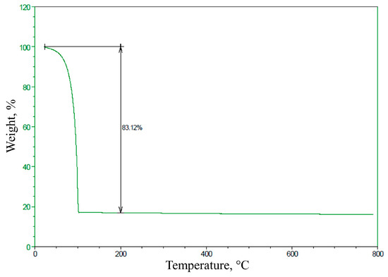 Since the samples were in suspension, we performed a thermogravimetric analysis. The thermogravimetric analysis of a sample of AuNPs was conducted to quantify the mass of the sample. The characterization of the AuNPs is shown in the resulting graph, in which the sample had an initial weight loss of 83.12%. The final weight corresponded to the presence of gold in the sample, while the rest was the medium in which the AuNPs sample was suspended. See Figure 4 for the thermogravimetric analysis of the AuNPs.