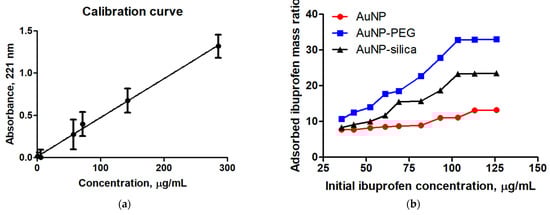 The calibration curve and the results of the absorbances obtained after incubation [61] can be seen in Figure 5a,b, respectively. (AuNPs, AuNPs–PEG, and AuNPs–silica). In the following graph, it can be seen how ibuprofen was able to adhere to the AuNPs sample; but from the first concentration, the AuNPs became saturated. It is also worth noting that from the first concentration, the drug continued to adhere to the nanostructures, which may be due to the drug anchoring to several layers on the nanostructures. On the other hand, in the AuNPs–PEG sample, there was an increase in the adhesion of the drug to the nanostructures until it reached saturation at a concentration of around 100 µg/µL. Similarly, it can be seen that the drug was able to adhere to the AuNPs–silica sample, anchoring in a greater amount compared to the AuNPs sample but anchoring in a smaller amount compared to the AuNPs–PEG sample. In this sample, saturation was observed from a concentration of around 100 µg/µL. It was observed that all samples ceased to adsorb the drug when an initial drug concentration of around 100 was used. This may be due to saturation of the drug adsorption sites on the surface of the nanocarriers, leading to an inability to further incorporate the drug. Alternatively, the high drug concentration may result in a decrease in the surface charge density of the nanocarriers, leading to decreased drug–nanocarrier interactions and reduced adsorption. Further investigation is needed to fully understand the mechanisms behind this phenomenon.