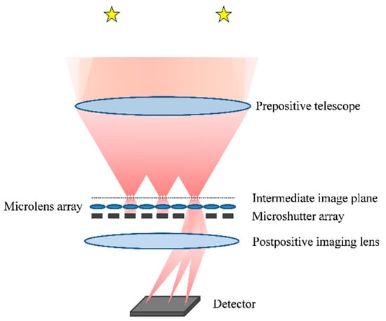 The optical path schematic diagram of a FOV-gated imaging system for all-time star sensors is presented in Figure 1. As shown in Figure 1, the system consists of three main components: a prepositive telescope with a telecentric beam path in the image space, a microlens and microshutter array, and a common postpositive imaging lens. Multiple stars are imaged on the intermediate image plane by the prepositive telescope with a large FOV, and the large FOV on the intermediate image plane is subdivided and gated by the microshutter and microlens arrays. The microlens element is combined with the postpositive imaging lens to magnify the stellar image on the intermediate image plane. The purpose of magnification imaging is to increase the focal length of an imaging channel, reducing the single-pixel FOV and suppressing the atmospheric background radiation. Since each microlens element has its own optical axis, which is parallel to the optical axis of the postpositive imaging lens, there are many imaging channels in the system. Through the quick switching of a microshutter, the stellar images in different gated FOV can be realized in a common detector. The FOV-gated optical imaging system combines the advantages of a wide FOV telescope and narrow gated FOV imaging, thus achieving a strong sky background radiation suppression effect within a wide FOV. This system is expected to realize multi-star detection and star pattern matching during the daytime.