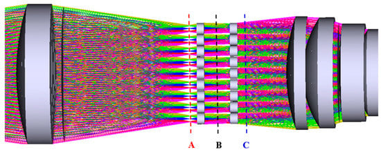 The microshutter array is a key device of the optical imaging system allowing the systemto switch the gated FOV rapidly, and its period is the same as that of the microlens array. The distribution of microshutter elements has a one-to-one correspondence with that of the microlens elements. An enlarged view of the area near the microlens in Figure 2 is displayed in Figure 3. As shown in Figure 3, there are three optional positions in the system for placing a microshutter array to realize the gating of a narrow instantaneous FOV: the intermediate image plane of the system, the middle of the microlens array group, and the rear of the microlens array group, which are denoted in Figure 3 by A, B, and C, respectively.