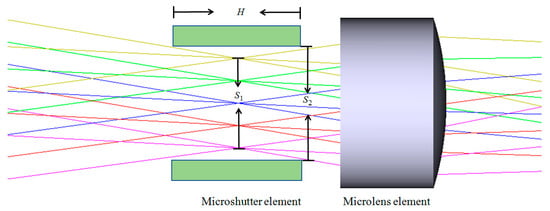 The light path diagram of a microshutter element placed on the intermediate image plane is presented in Figure 4. As the focal length of the prepositive telescope in the proposed system is 300 mm, the size of a gated FOV is 0.4°, and the corresponding size of the intermediate image plane . Considering that the microshutter element has a certain thickness, and the light beam has a divergence angle when passing through the microshutter element, the actual clear aperture of the microshutter element should be larger than 2.1 mm. Assume that the thickness of the microshutter element is H = 4 mm and the intermediate image plane is located in the middle of the microshutter element. Then, since the relative aperture of the prepositive telescope is 1/3, the clear aperture of the microshutter element should be at least . Further, to ensure the side length duty cycle of the microshutter element is not less than 70%, the period of the microshutter array should be not more than 4 mm. Finally, considering the response time requirement of a microshutter array in practical applications, the main design indexes of the microshutter element are set as shown in Table 1.
