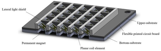 The schematic diagram of a microshutter array based on the electromagnetic actuation is presented in Figure 5. The microshutter array consists of a permanent magnet array, a lateral light shield array, an upper-substrate, a flexible printed circuit board (FPCB) with a planar coil array, and a bottom-substrate. The lateral light shield array is fabricated on the upper-substrate and combined with the permanent magnet array to form a rectangular grid. A planar coil array can be fabricated in a FPCB, and the FPCB bonded to the bottom-substrate. Each planar coil element is placed between two permanent magnets, leaning on one of them and acting as a microshutter element. The electrode of each planar coil is extracted by a FPCB and used as a torsion beam of the planar coil. It should be noted that when a planar coil element carries the current, it will deflect with the torsion beam as the axis by the electromagnetic force in the magnetic field, so the microshutter element is turned on. When the current in the planar coil element is removed, the planar coil element will deflect in the reverse direction by the restoring force of the torsion beam, closing the microshuter element. There is a square hole array fabricated on the bottom-substrate, where each square hole corresponds to a microshutter element and the side length of a square hole element determines the clear aperture of a microshutter element. The microshutter array can meet the application requirements for millimeter-level cell size, high duty cycle, high response speed, and low cost without using complex MEMS processing technology.