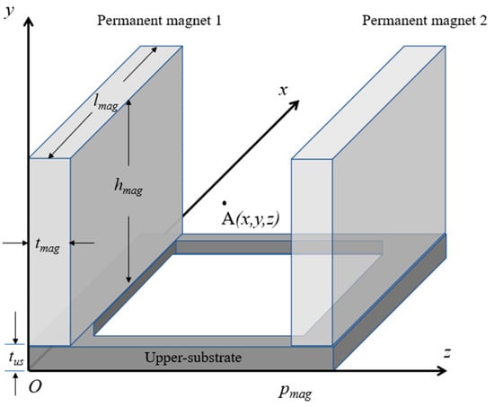 Assume that the length, height, and thickness of each permanent magnet in a microshutter element are denoted by lmag, hmag, and tmag, respectively. Further, establish a rectangular Cartesian coordinate system with the lower left corner of the upper -substrate in a microshutter element as the coordinate origin, as shown in Figure 6. Then, the magnetic field intensity generated by permanent magnet 1 at point A(x, y, z) in the space between two permanent magnets is given by []: